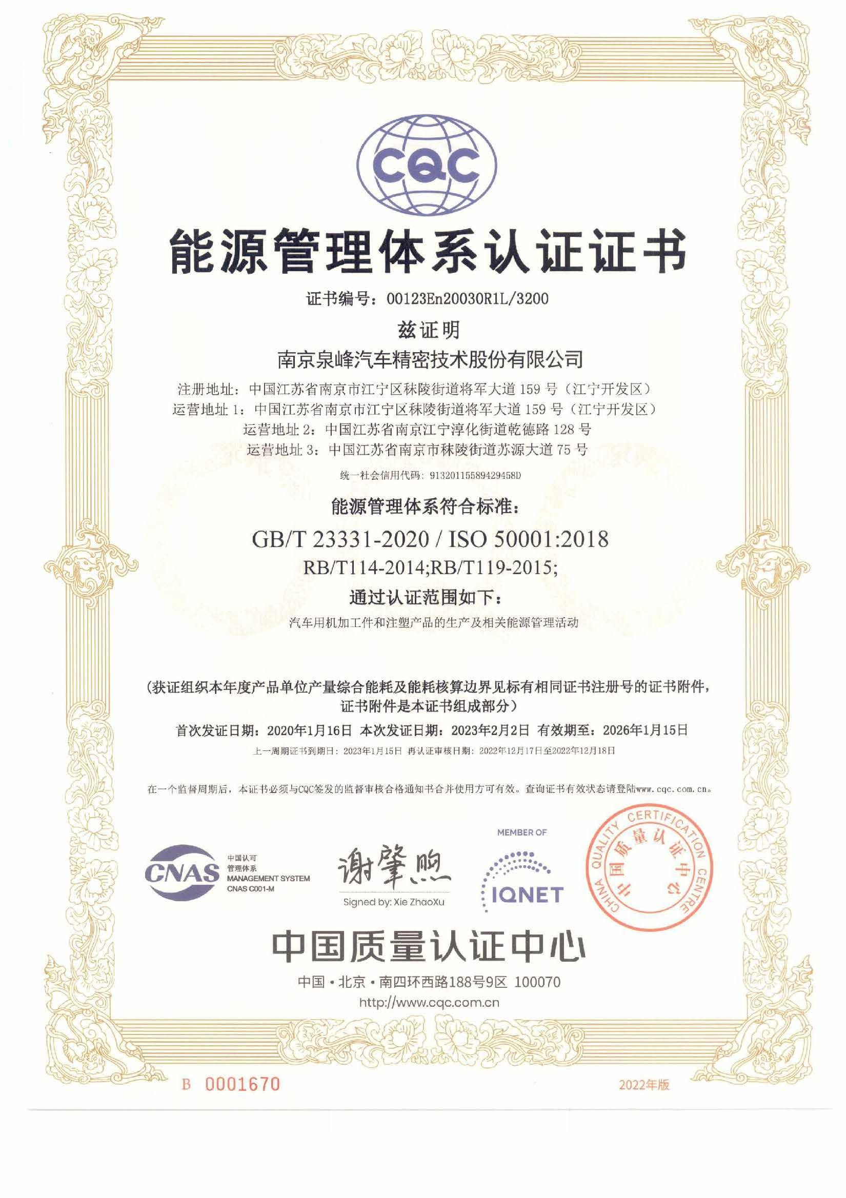 南京泉峰ISO50001證書