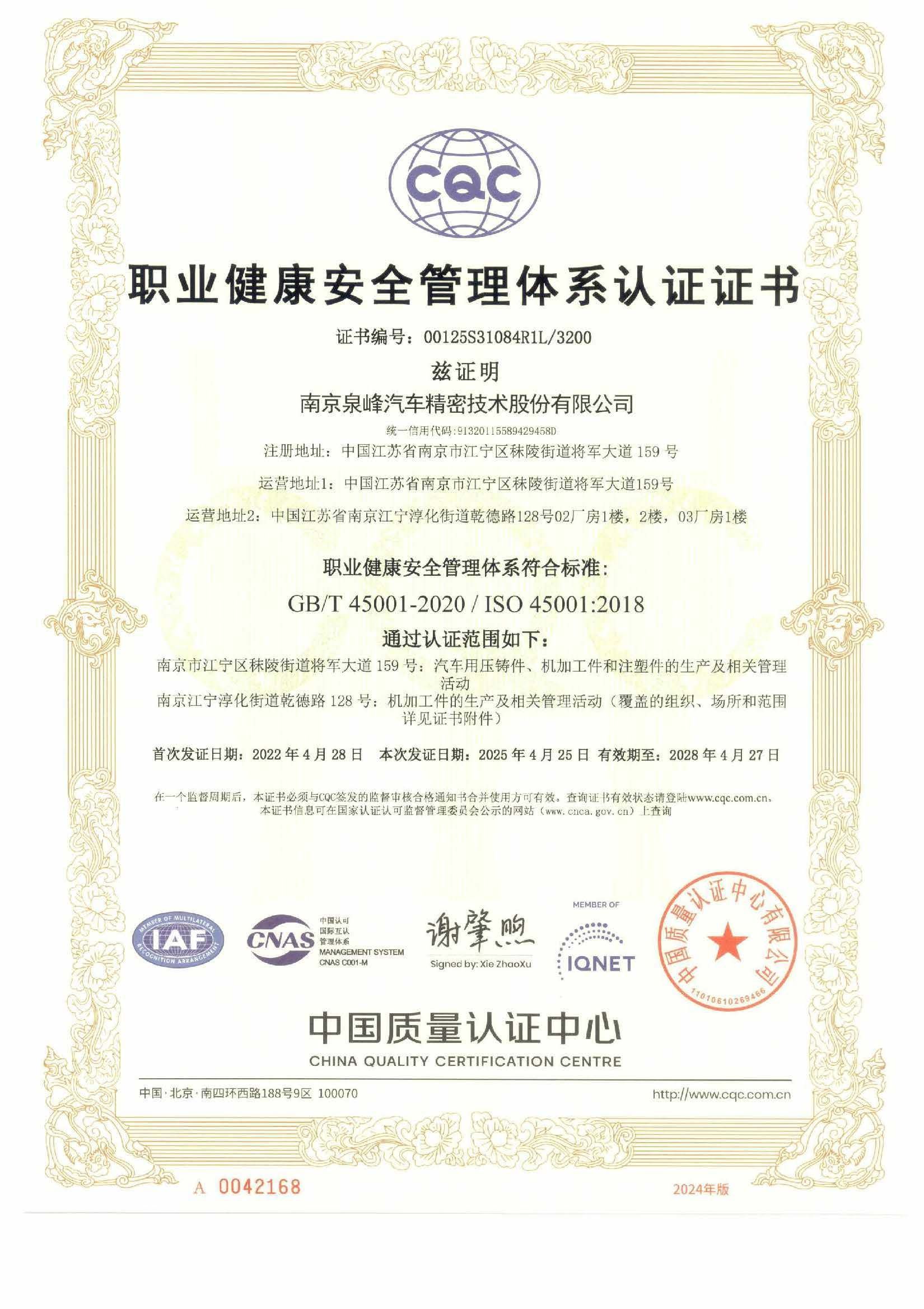 南京泉峰ISO45001證書